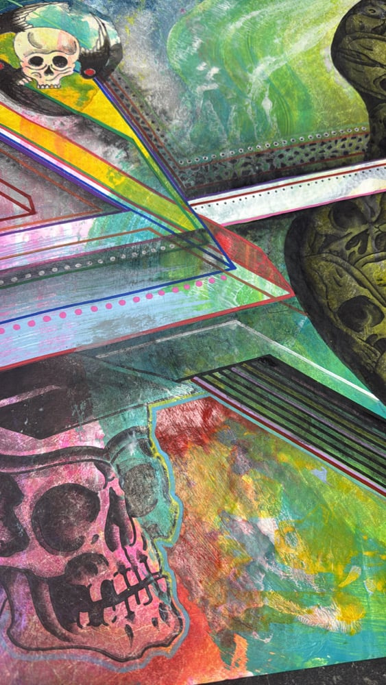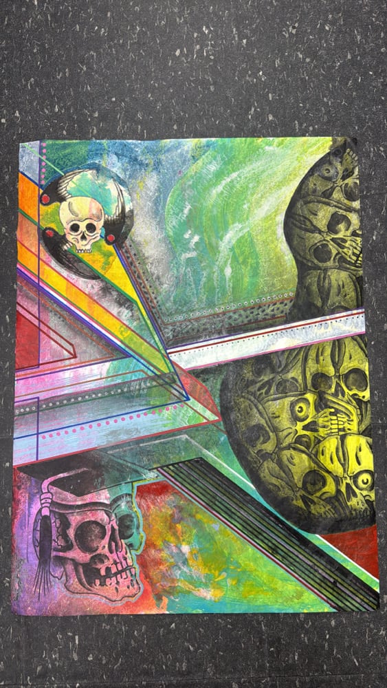 split painting with Greg Christian, acrylic and tattoo stencils on an 18x24 piece of tyvek